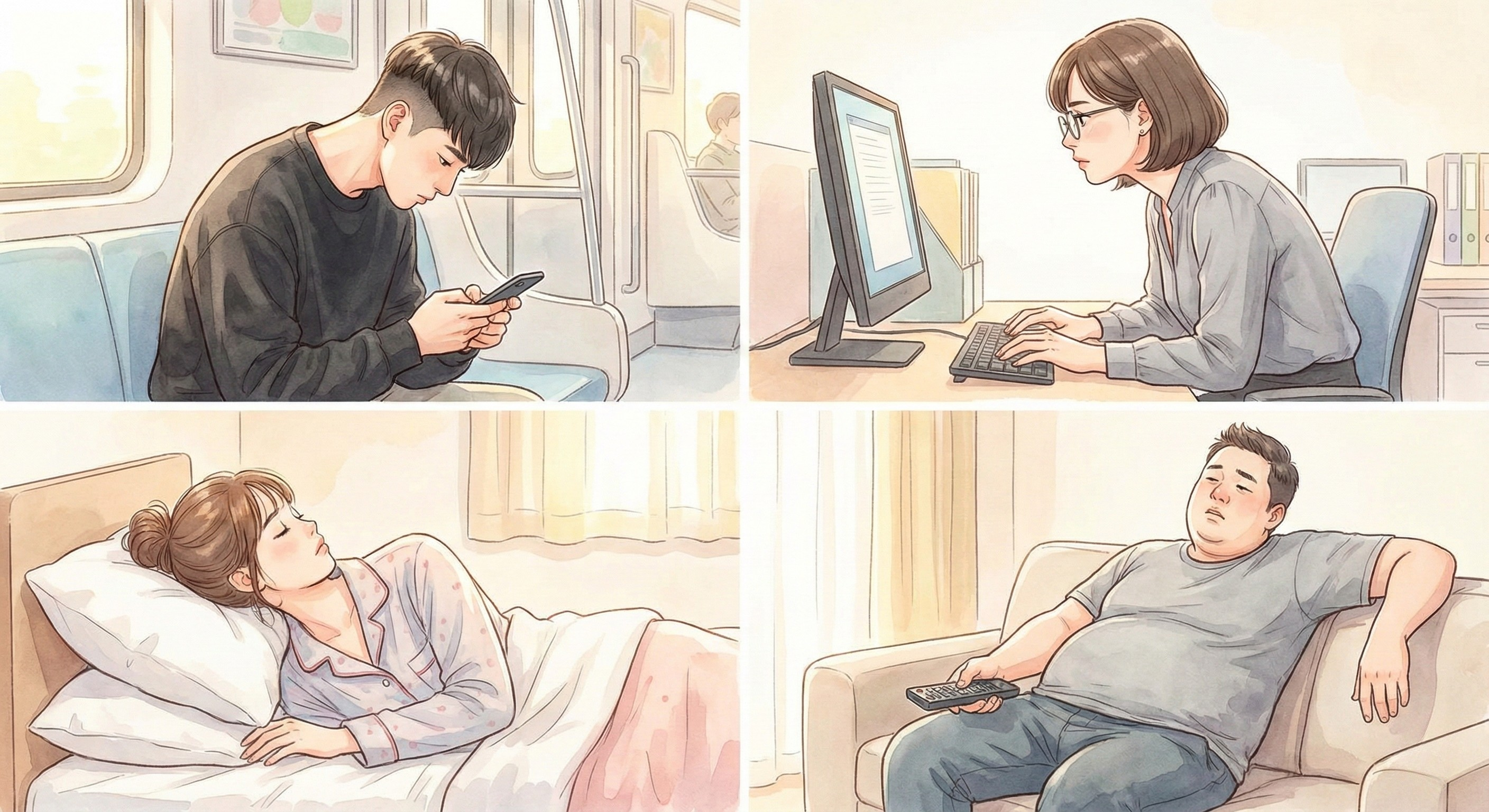 첫 번째, 스마트폰이에요. 고개를 푹 숙이고 스마트폰 보는 자세, 다들 익숙하시죠? 이 자세가 목에 엄청난 부담을 줘요. 하루에 스마트폰 3~4시간씩 본다고 하면, 목은 매일 수십 킬로그램의 하중을 버티는 셈이에요.