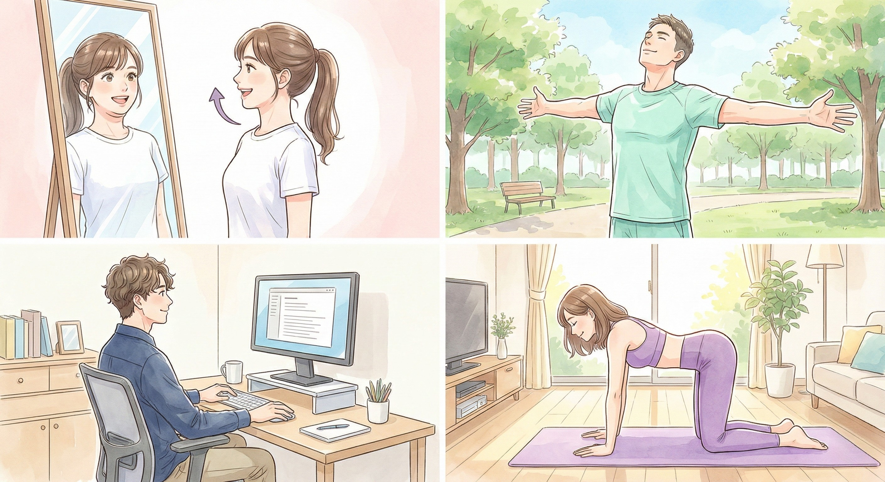 환경부터 바꿔야 해요. 모니터는 눈높이로 올리고, 의자에 깊숙이 앉아서 등받이에 등을 붙이세요. 노트북 쓸 때는 별도 키보드를 연결하고 화면을 높이는 게 좋아요. 스마트폰은 가능하면 눈높이로 들어서 보세요.