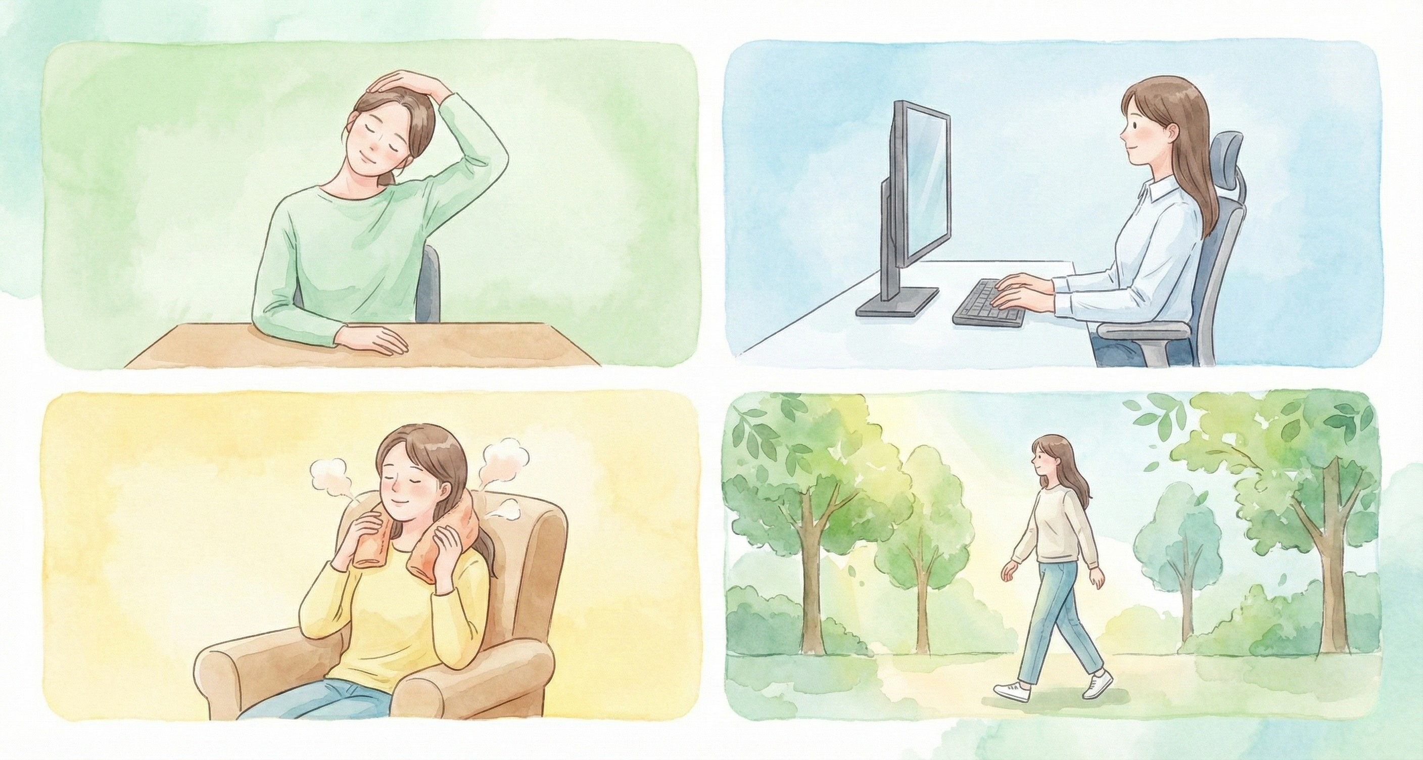 온찜질도 효과 좋아요. 퇴근 후에 뒷목이나 어깨에 따뜻한 수건 올려두면 근육이 풀리면서 두통이 완화돼요. 15~20분 정도면 충분해요.