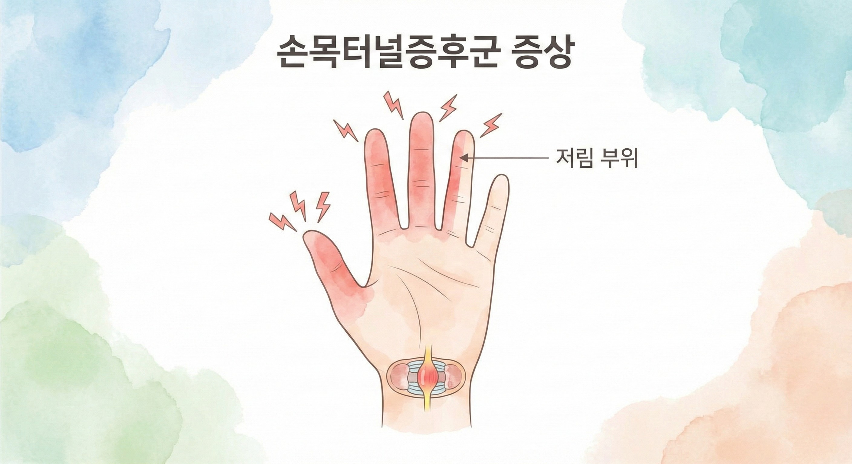 손목터널증후군의 증상은 초기에는 가볍게 시작해서 점점 심해지는 경향이 있어요. 처음에는 "좀 저리네" 정도였다가, 나중에는 일상생활에 지장을 줄 정도가 되기도 합니다.
